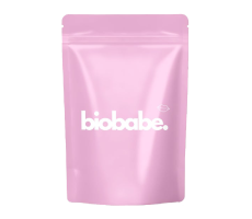 Three pink packaging bags with the word 'biobabe' printed on them.